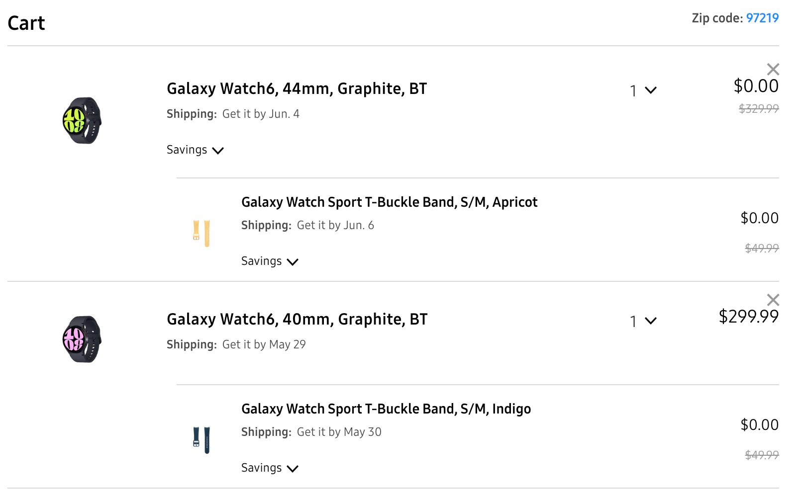 I should point out that Samsung seems to be giving you the more expensive option you choose for free. As an example, you can see above where I added both 44mm ($329) and 40mm ($299) watches to cart with custom band choices and received the 44mm version free.