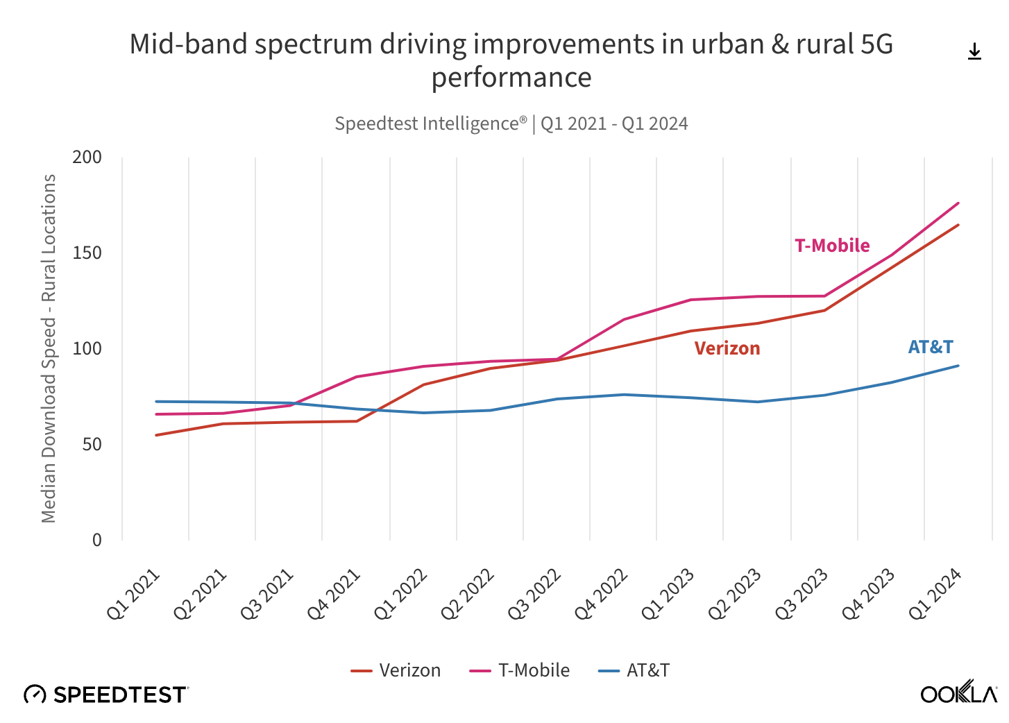 While the city slickers have been the ones mostly enjoying the benefits of all these speed improvements, both Verizon and T-Mobile have been putting in more work into bumping up its more rural 5G offerings too. According to the data, both carriers have seen added speeds thanks to recent mid-band spectrum deployments. The graph below highlights these improvements, with AT&T only seeing a slight bump in rural median download speeds.