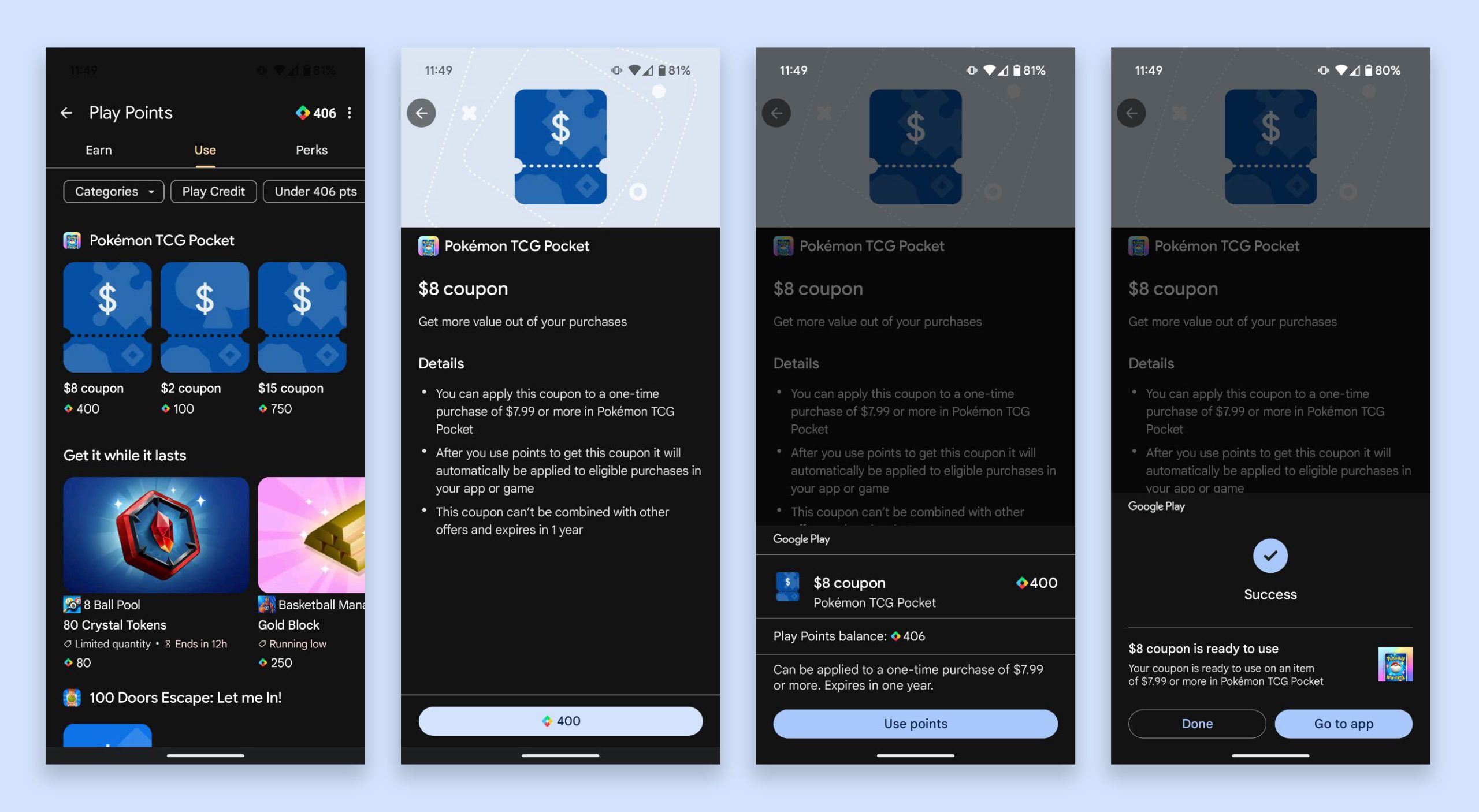 Google Play Points is offering up free coupons that you can use to purchase Poke Gold in Pocket. There are $15, $8, and $2 coupons that you can buy with Play Points. The $15 coupon costs 750 points, the $8 coupon costs 400 points, and the $2 coupon costs 100 points. I had a ton of points sitting around, so I was able to buy these coupons multiple times.
