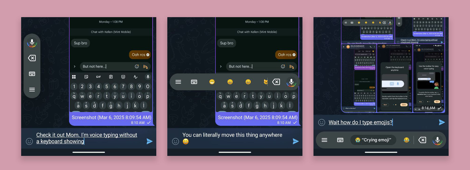 To activate it, you’ll hit the voice typing icon in Gboard and then press a new down-arrow icon next to it. This down-arrow button will shrink the keyboard into the Voice Toolbar at the bottom of your screen, where you can then speak away at your device. It’ll remain there unless you hit the keyboard button to expand to the full keyboard again, plus you can move the toolbar around.