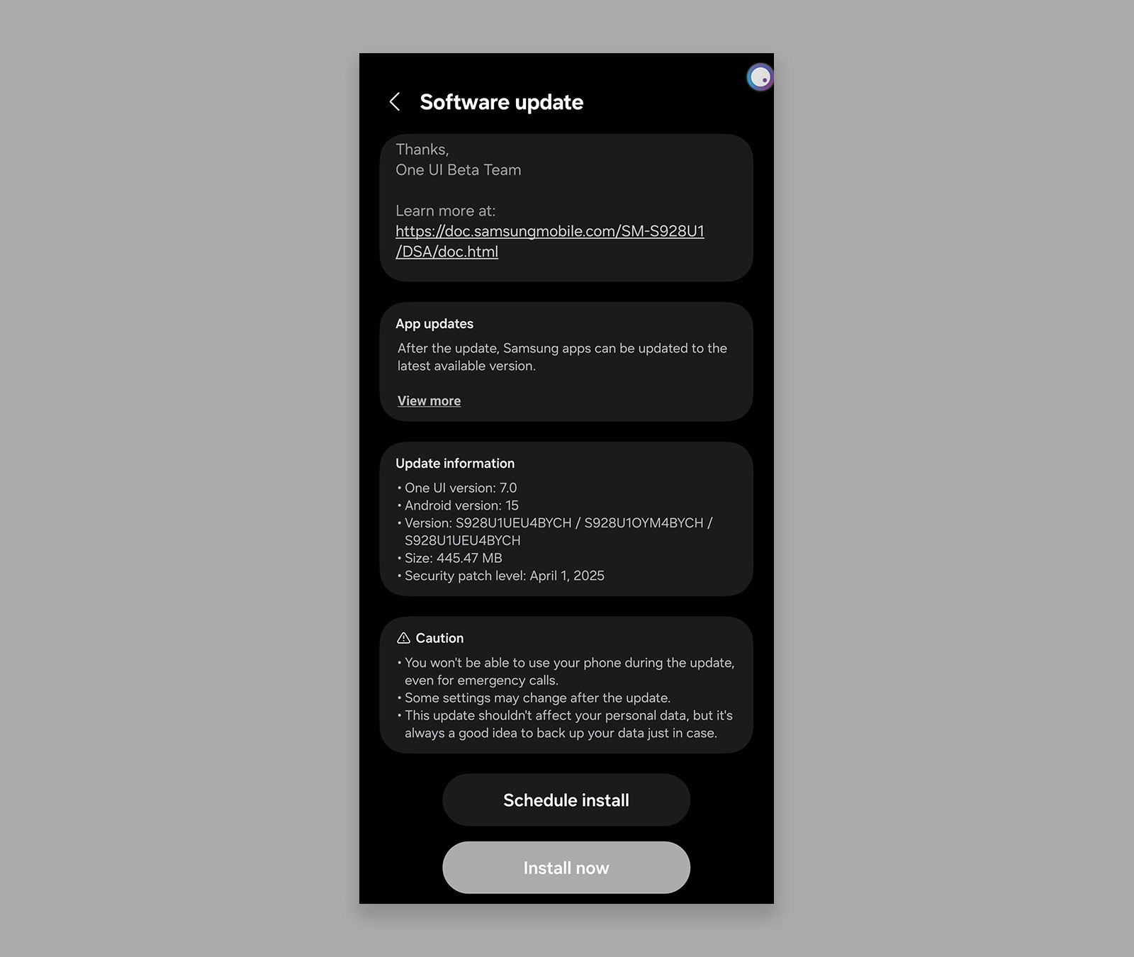 Again, the theme I’m seeing mostly involves those who were in the One UI 7 beta program. In fact, the update screen for these beta testers is a “Thank you” from the Samsung One UI Beta Team to those participating, which we can see from this user. The build they are receiving is S928U1UEU4BYCH on the Galaxy S24 Ultra.