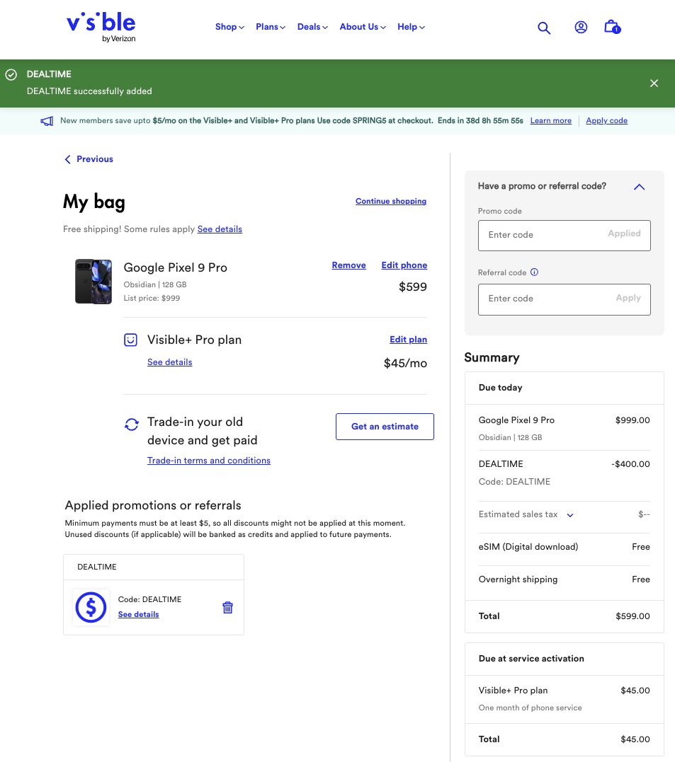How does this Pixel 9 Pro deal work? It’s pretty simple because Visible keeps things simple. You have to be a new customer who signs up for the Visible+ Pro plan, which costs $45 per month. As a part of signing-up for that plan, you add whichever Pixel 9 series phone to the cart that you want, then apply coupon code “DEALTIME” and see the cash just wash off the final price.
