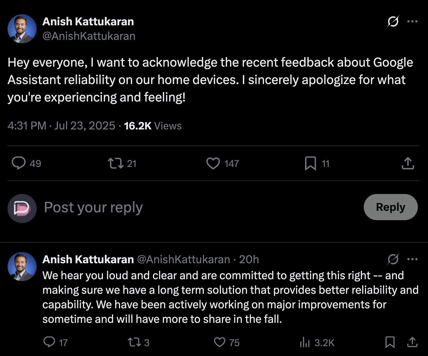 Google’s Chief Product Officer for Google Home, Anish Kattukaran, randomly took to Twitter this week to acknowledge to the world that they have heard your feedback about the failings of Google Assistant on Home products. In his post, he “sincerely” apologized for current experiences that folks are having and then committed to getting it all right.