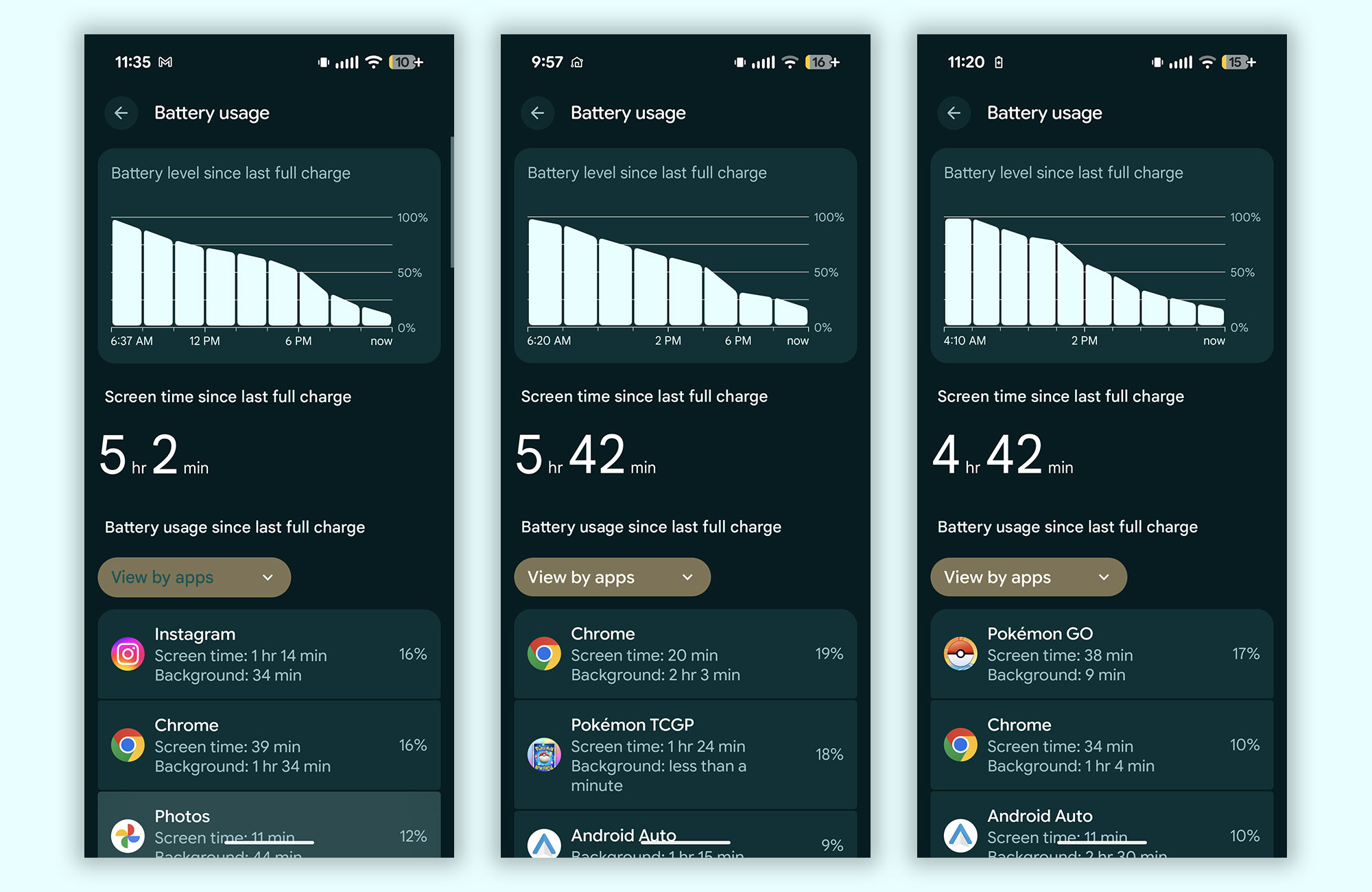 Battery life. There’s this new Tensor G5 chip inside the Pixel 10 Pro models and slightly bigger batteries for both devices. Google did not promise any major improvements in battery life, though. They are still claiming that you’ll get 24+ hour battery life and that’s probably right. As you’ll see in the battery usage images below, I was typically around 4.5 to 5.5 hours of screen on time and going to bed with 10-20% battery remaining with a Pixel 10 Pro XL. That’s solid for me and actually bordering on heavier use. I hit Pokemon GO pretty hard during my review weeks and this thing held up to that abuse quite well in the sun, with brightness cranked, and using a 5G connection for most of the time.